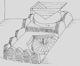 Mahlwerk wurde das Mahlgut gesammelt und durch Sieben das Mehl