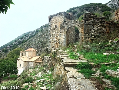 weitgehend verfallenen, Klostergebäuden überragt. Die Mönche