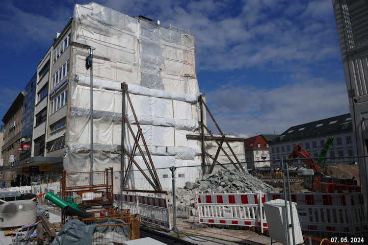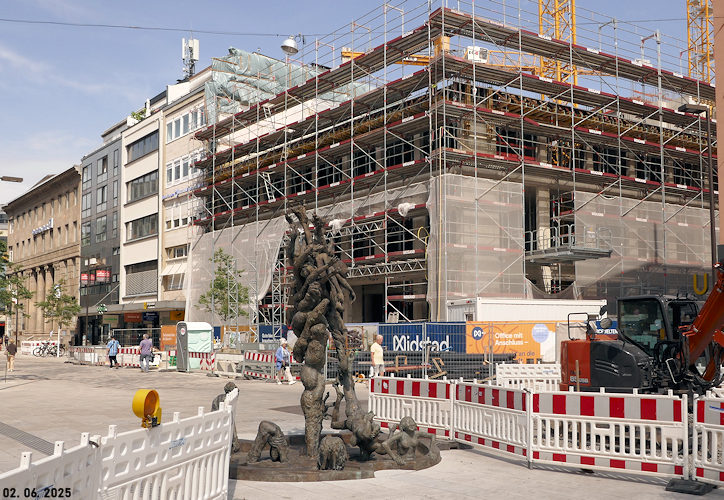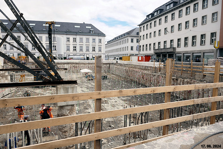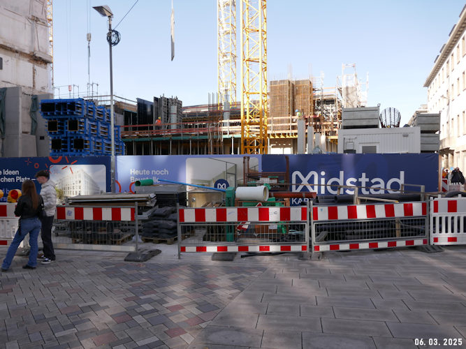 Das Midstadt-Gebäude wächst. Im Vordergrund der wieder aufgebaute Lammbrunnen.