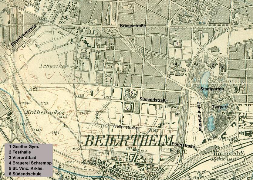 Quelle: Topographische Karte 1 : 25 000 des Großherzoglich Topographischen Bureaus von 1914, Ausschnitte Blatt Karlsruhe und Ettlingen, verändert.