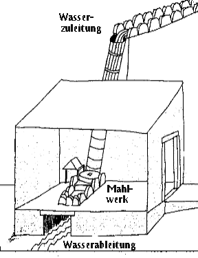 steingedeckte Mühlengebäude mit demWasserzulauf auf